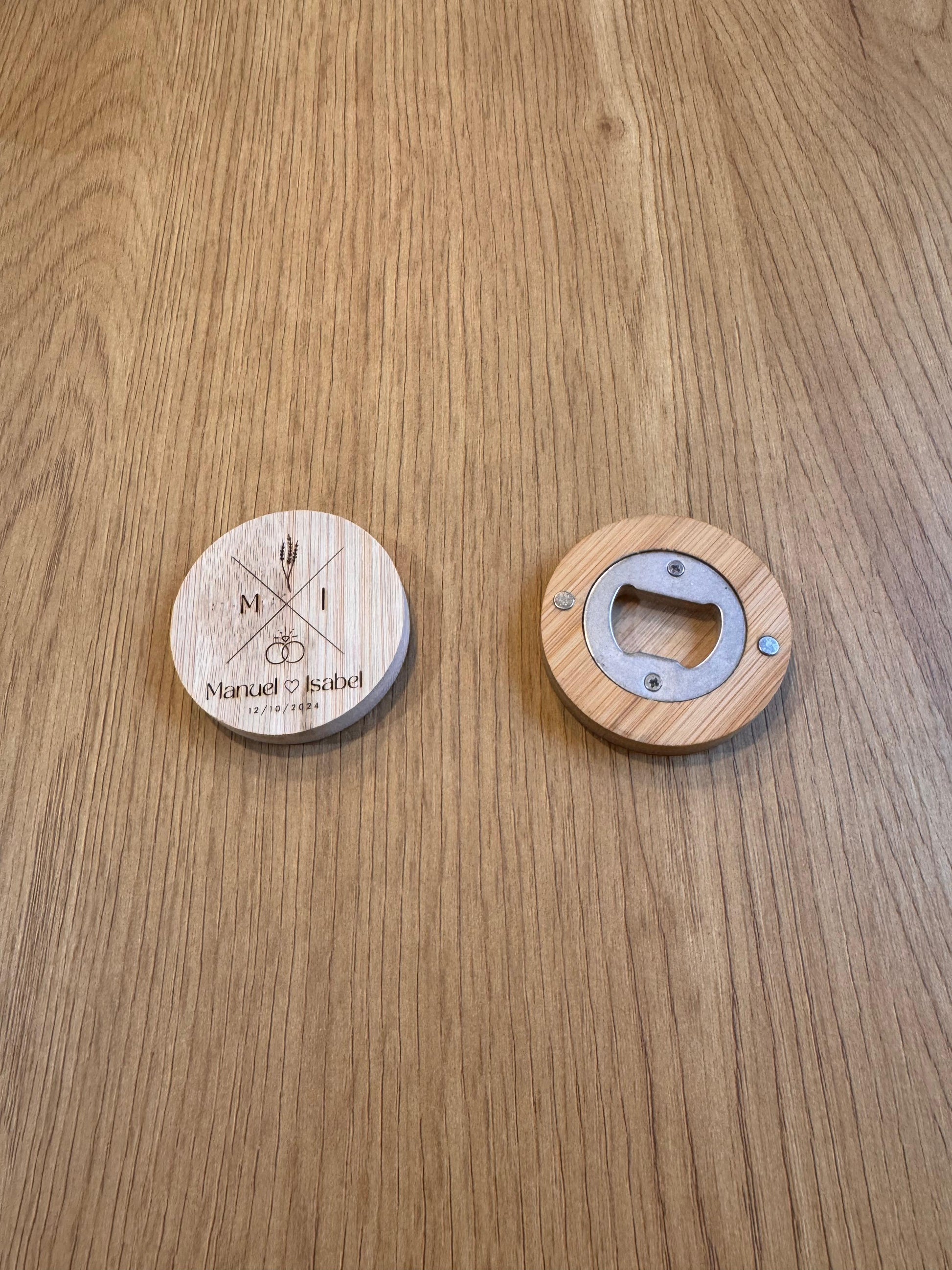 Haz que tus invitados recuerden tu gran día con este abridor con imán personalizado para boda, un detalle original, práctico y con encanto.