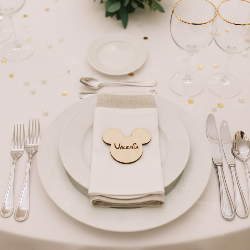 Inspirados en el icónico personaje de Mickey Mouse y con una tipografía tipo Disney, estos marcasitios de madera personalizados son el detalle perfecto para bodas con niños, mesas dulces o rincones infantiles. Cada pieza se graba con el nombre del invitado, convirtiéndose no solo en un marcasitio, sino también en un recuerdo inolvidable que podrán llevarse a casa.