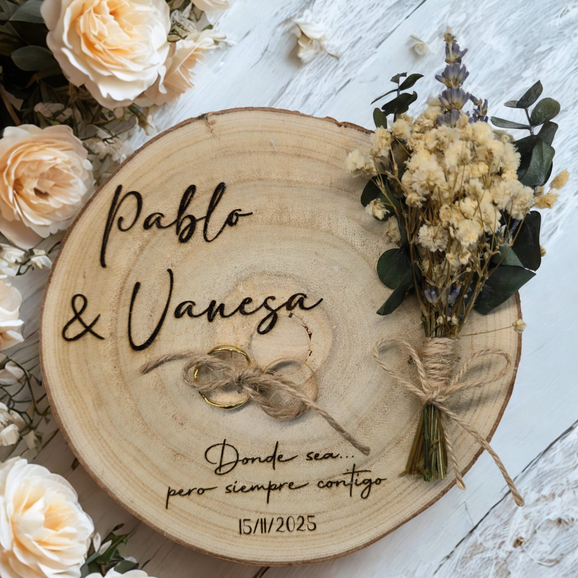 Haz que el momento más emotivo de tu boda sea aún más especial con nuestro porta alianzas original. Diseñado con materiales de alta calidad y un estilo exclusivo, este accesorio es el complemento perfecto para presentar los anillos de boda con elegancia y encanto. Ideal para bodas románticas, este porta alianzas aportará un toque único y memorable a tu ceremonia, dejando una huella imborrable en tus invitados.